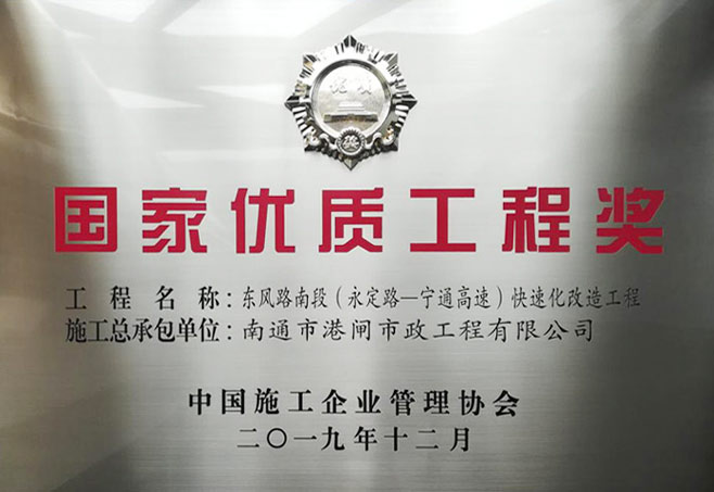 12月8日上午,由中國施工企業管理協會主辦的2019年國家優質工程獎總結表彰大會在國家會議中心召開,會上對獲得2018~2019年度國家優質工程獎的單位進行了表彰,我公司承建的泰州東風路南段快速化改造工程獲此殊榮!